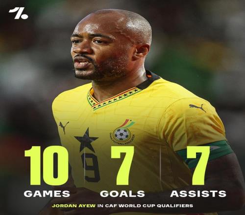 在10场世非预比赛中,34岁的老将乔丹·阿尤9场首发1次替补,单人贡献了7球7助攻,暂列世非预助攻榜头名和射手榜第6位,成为加纳晋级世界杯的最大功臣。