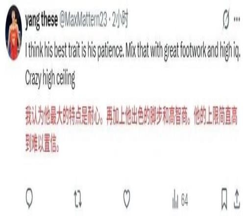 可是在内行看来,一名新秀在季前赛就能拿出这样的数据,已经做得很不错了,比如开拓者的队记就公开表示,杨瀚森季前赛能得到这样的数据,应该给他竖大拇指,因为之前大家不认为他能够得到这样的数据,可是杨瀚森做到了,觉得杨瀚森了不起,在一些内行看来,季前赛要求一名新秀砍下14分20个篮板,这是不现实的。
