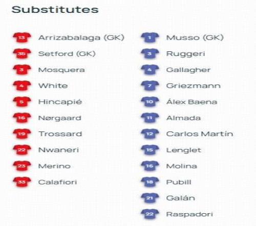 阿森纳首发:1-戴维-拉亚、2-萨利巴、6-加布里埃尔、7-萨卡、10-埃泽、11-马丁内利、12-廷贝尔、14-哲凯赖什、36-苏比门迪、41-赖斯、49-刘易斯-斯凯利