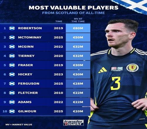 北京时间11月16日,德转列出了苏格兰历史身价排名前10的球员,2019年身价曾经达到8000万欧元的罗伯逊高居第一,麦克托米奈5000万欧元第二,麦金和蒂尔尼同以3200万欧元并列第三。