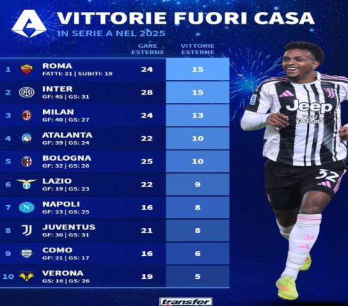 北京时间12月15日,德转列出了意甲俱乐部2025年各项赛事客场比赛赢球场次前10,罗马和国际米兰以客场15胜并列第一,那不勒斯和尤文图斯仅在客场取胜8次。