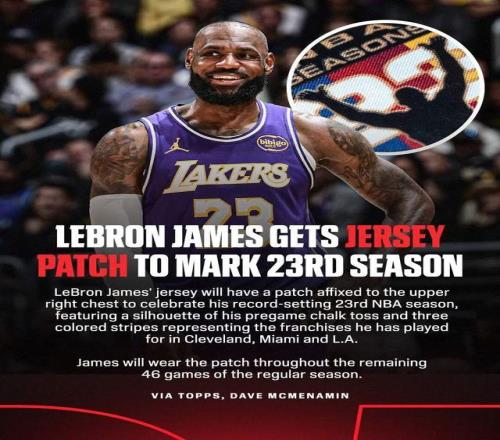 从对阵国王开始,詹姆斯球衣的右上角将固定缝制一个特殊补丁,图案内容为一个他赛前标志性的撒镁粉动作剪影,四道彩色条纹,分别代表他生涯的四个阶段。