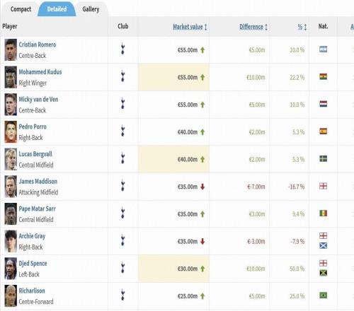 热刺球员身价变更:库杜斯上涨1000万欧,麦迪逊下跌700万欧